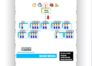 - Modalità comunicazione da uno a molti. I "molti" sono spesso un pubblico indistinto ed indifferenziato ma tuttora costituito da un gran numero di persone.