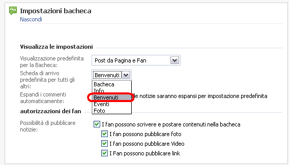 - Adesso non ti resta che cliccare su "Modifica la Pagina", "Impostazioni Bacheca", "Modifica" , "Scheda di arrivo predefinita per tutti gli altri" e scegli il titolo della scheda che hai appena creato.