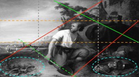 La composizione del quadro è giocata sul passaggio dalla zona in piena ombra di destra all’ampio e luminoso orizzonte a sinistra. L’occhio è guidato da una serie di linee che costruiscono la composizione. Alcune segnano proprio il passaggio ombra-luce (in rosso), altre invece aprono verso l’orizzonte (in verde). La linea formata dal manico della pala utilizzata dall’uomo porta il nostro sguardo verso la torre campanaria di una chiesa in basso nella vallata, a indicare la fede che guida la vita, in questo caso viene evocato il suono delle campane che segna il ritmo della campagna. L’elemento principale della tavola è nello sguardo dell’uomo. Non è rivolto verso il tesoro bramandolo, non è rivolto nemmeno verso i due contadini in basso (nel cerchio bianco tratteggiato) come possibili rivali nella conquista del tesoro, ma è rivolto verso qualcosa che è al di là del quadro, che noi non possiamo cogliere, ma solo immaginare.